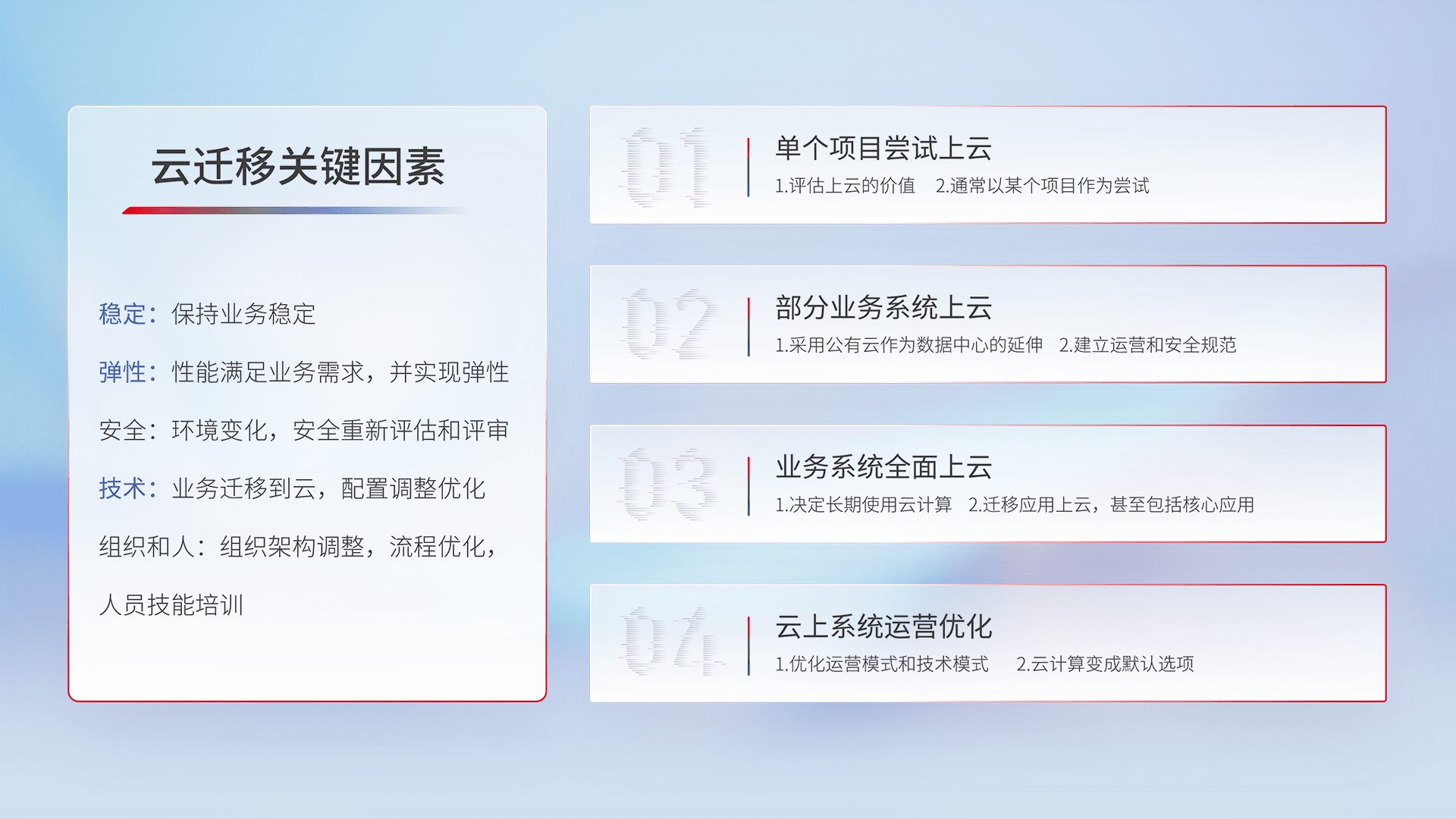 结合实际业务,,,,从规划设计、、、云平台选型、、云原生改造、、、、数据迁移、、、、集成交付,,迁移全过程为客户识别最佳上云路径,,做好风险识别管理,,设计网络架构、、、、身份权限、、、、安全审计合规、、、、操作审计、、日志审计、、监控告警策略、、多站点容灾设计等,,,对云上基础设施进行整体规划,,,提升IT治理水平,,以满足弹性、、、、高可用、、、、高性能的需求。。