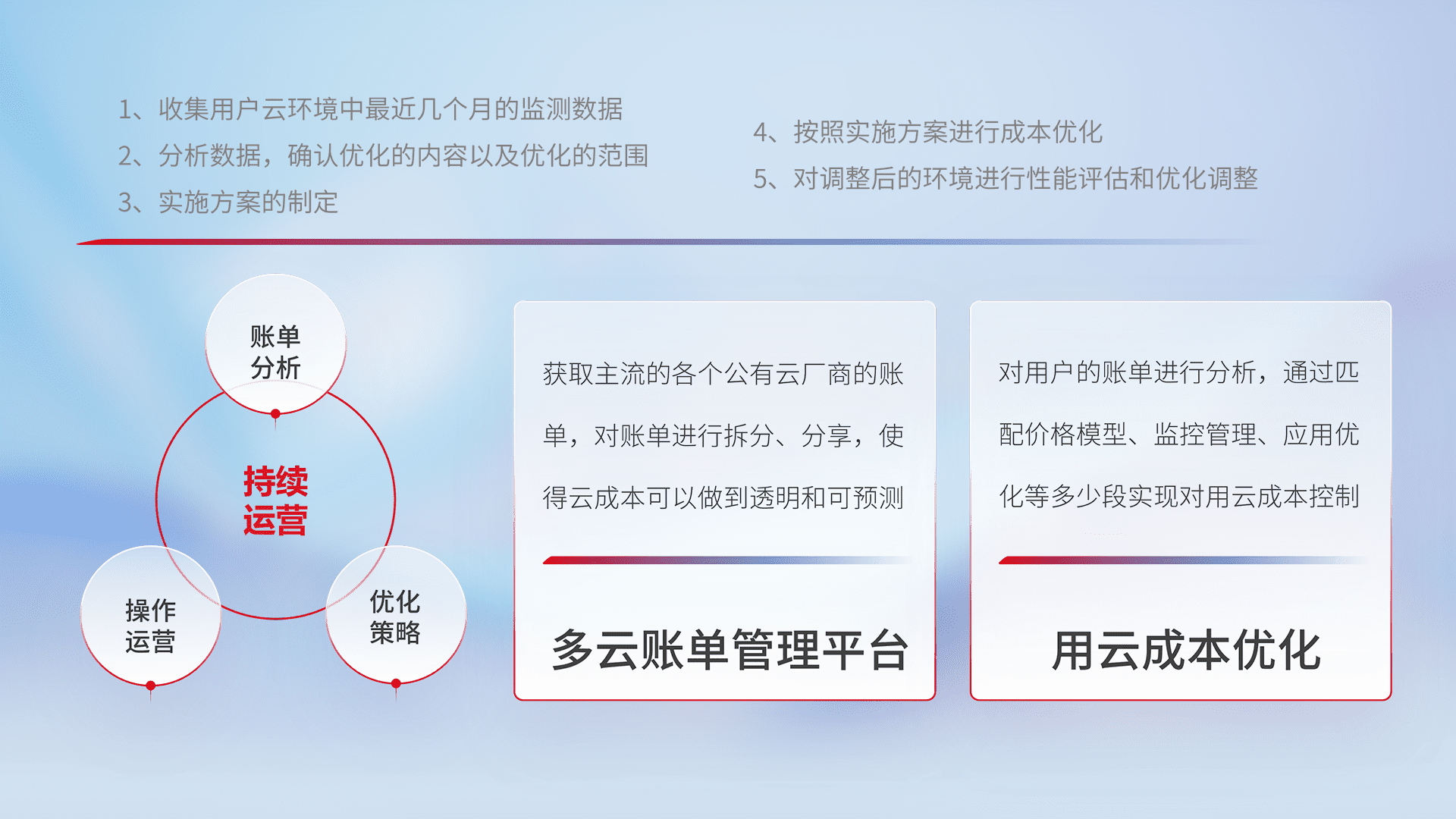 通过多云纳管,,,以统一的资源数据模型把客户的云资源进行抽象和封装,,,进而实现对多云资源的统一操作,,,保障云资源管理的可靠性、、、、稳定性与可用性。。。。量身定制化运维内容,,配置、、开发运维、、、、补丁管理、、、备份、、、、监控、、、、认证和访问管理、、审计和日常巡检等,,保障在用云过程中的可靠度,,,稳定度以及高可用率。。。。