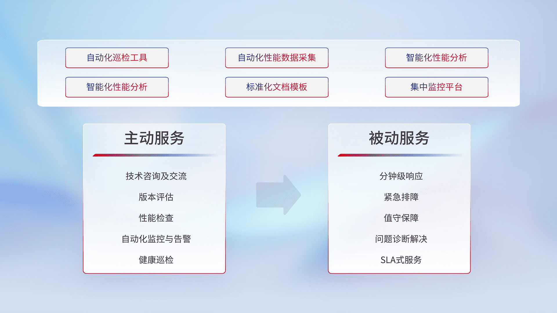 智能化工具和标准化文档,,,保障服务质量,,,提供主动服务(包含技术咨询、、、版本评估、、、、性能检查、、自动化监控与告警、、、健康巡检)和被动服务包含(分钟级响应、、紧急排障、、值守保障、、问题诊断解决、、、、SLA服务)。。。